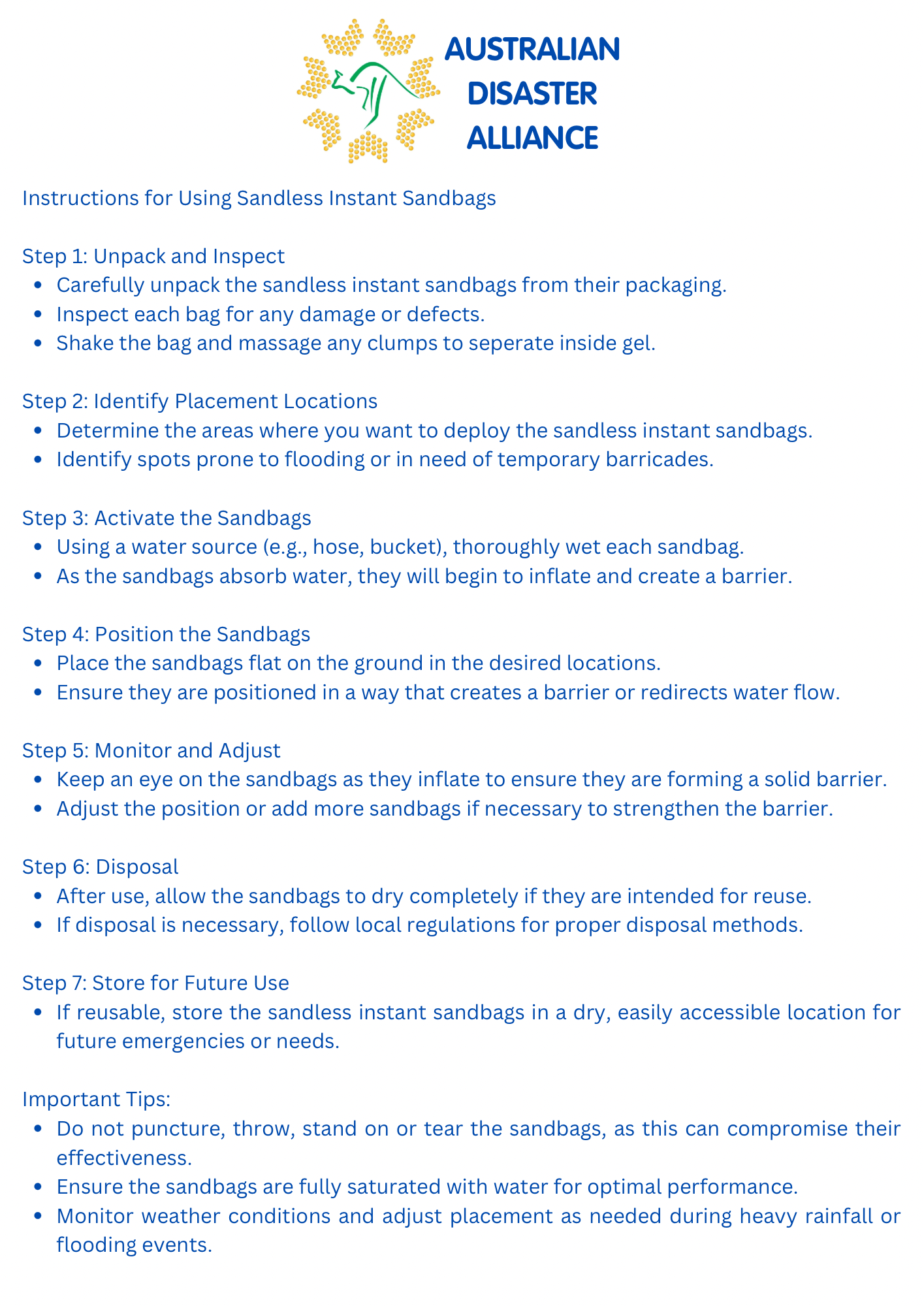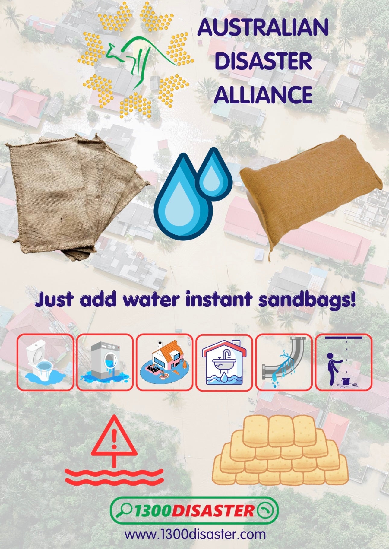 The Sandless Sandbag can be used to absorb, contain or divert water as you require. Useful for builders to divert water or protect storm water drains, useful to homeowners to protect property or divert water and useful for councils, emergency services and businesses.