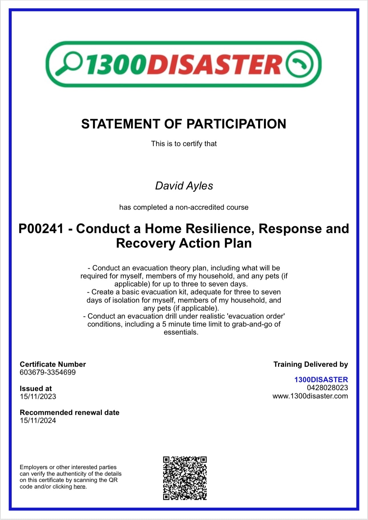 - You will receive a non-accredited certificate (P00241 - Conduct a Home Resilience, Response and Recovery Action Plan), an in-depth resilience inspection on your place of accommodation, education and training on tips and things you need to know to be prepared for a disaster event. We recommend you ask your insurance provider for a discount on your policy based on your inspection and any improvements made to your resilience capabilities. VALUED at $150
